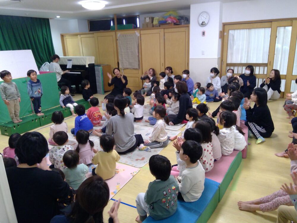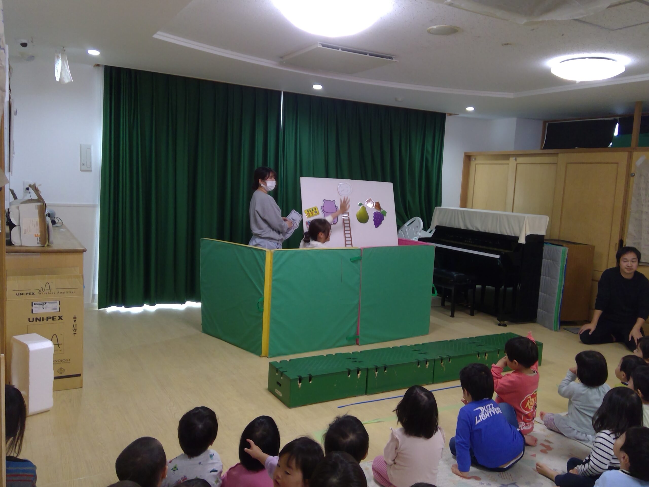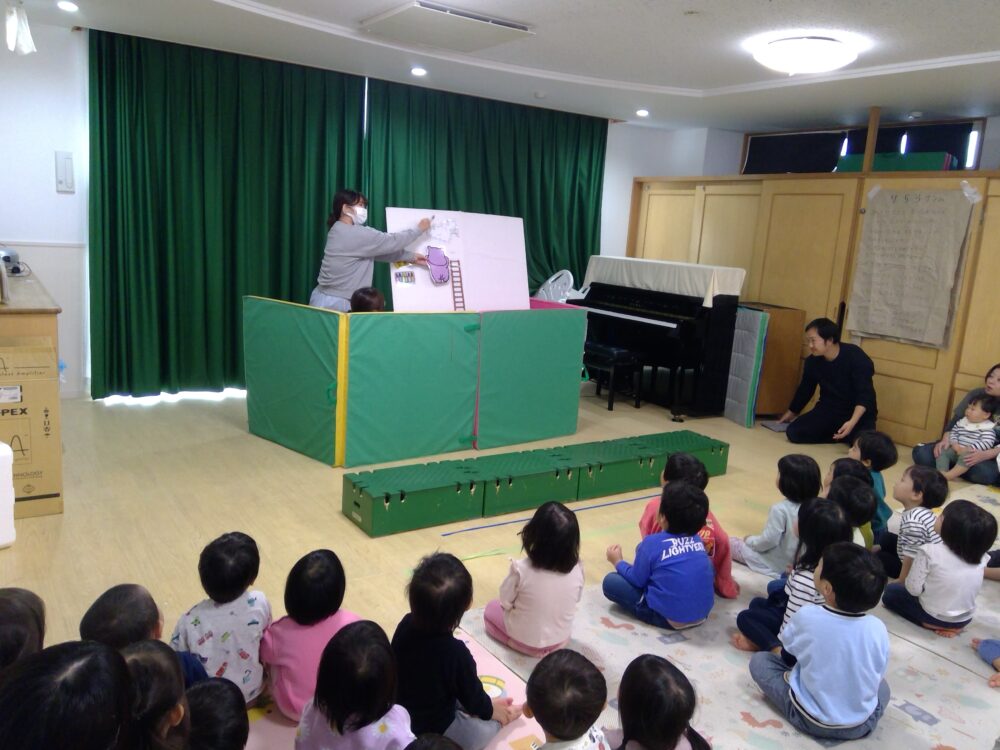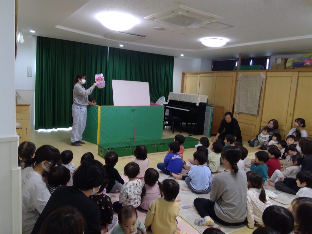 お誕生日のお友だちをお祝いした後は、パネルシアターの「かばさんのぬりえ」を見ました。かばさんが雲を塗る姿を見て、雲が何になるのか予想しながら楽しみました。