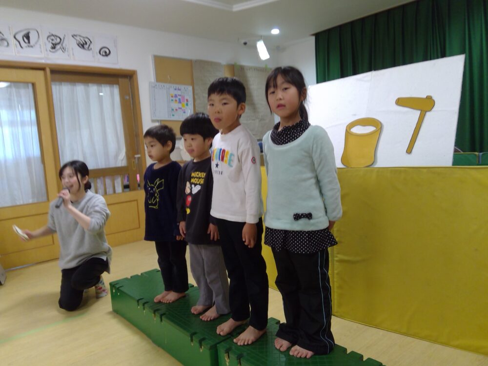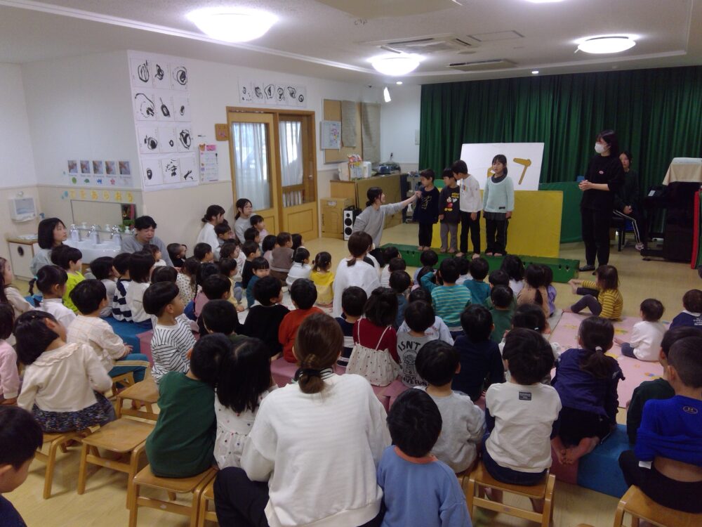 お誕生日のお友だちは名前を呼ばれると元気な声で返事をして前に出てきてくれました。また、インタビューでは名前や好きな食べ物、大きくなったら何になりたいかということを教えてくれました。インタビューの内容を聞いて「そうなの!」「かっこいいね!」という声が聞こえてきました。