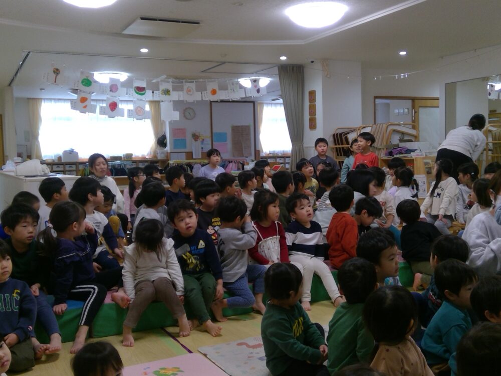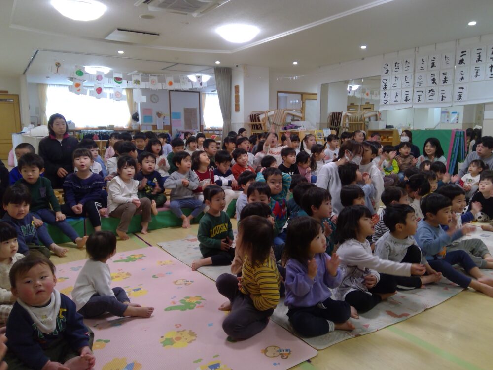 先生からのお話のプレゼントでは「まぜもち」のパネルシアターを見ました。歌に合わせてお餅をぺったんとついたり出来上がったお餅やお餅のケーキを美味しそうに食べたりする姿が見られました。