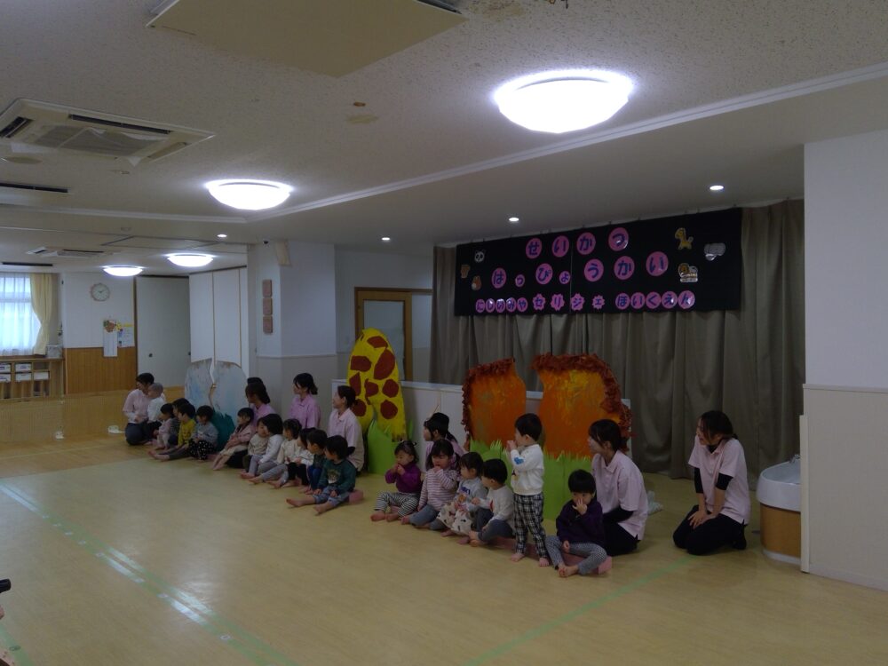 乳児クラスの生活発表会がありました。元気いっぱいに表現する子どもたちの姿がとても微笑ましかったです。お話あそびの中に一年間の成長が節々に感じられ感動しました。お話遊びが終わった後、子どもたちから楽しかった!という声が聞こえ印象深かったです。