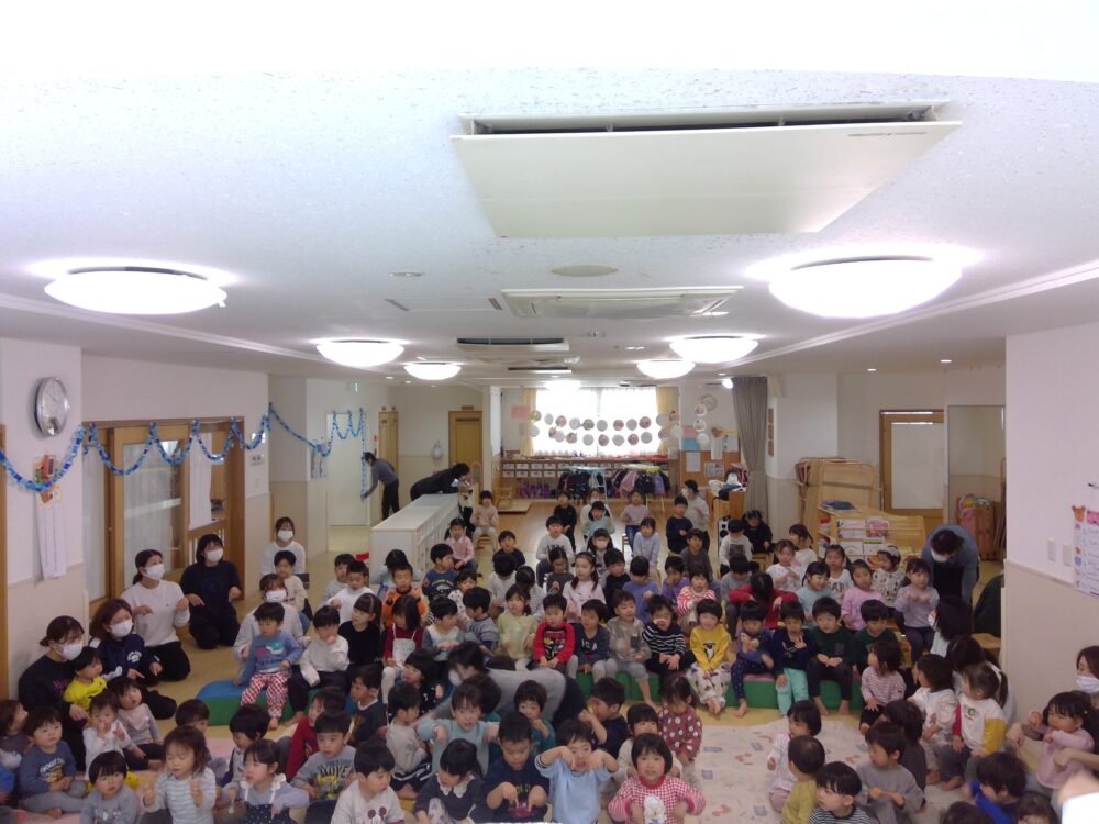 3月の誕生日会をしました。誕生児のお友達にインタビューをしたり、ハッピーバースデイの歌を歌ったたりしてお祝いしました。そして、保育教諭からのお話のプレゼント「どんな色が好き?」を見ました。